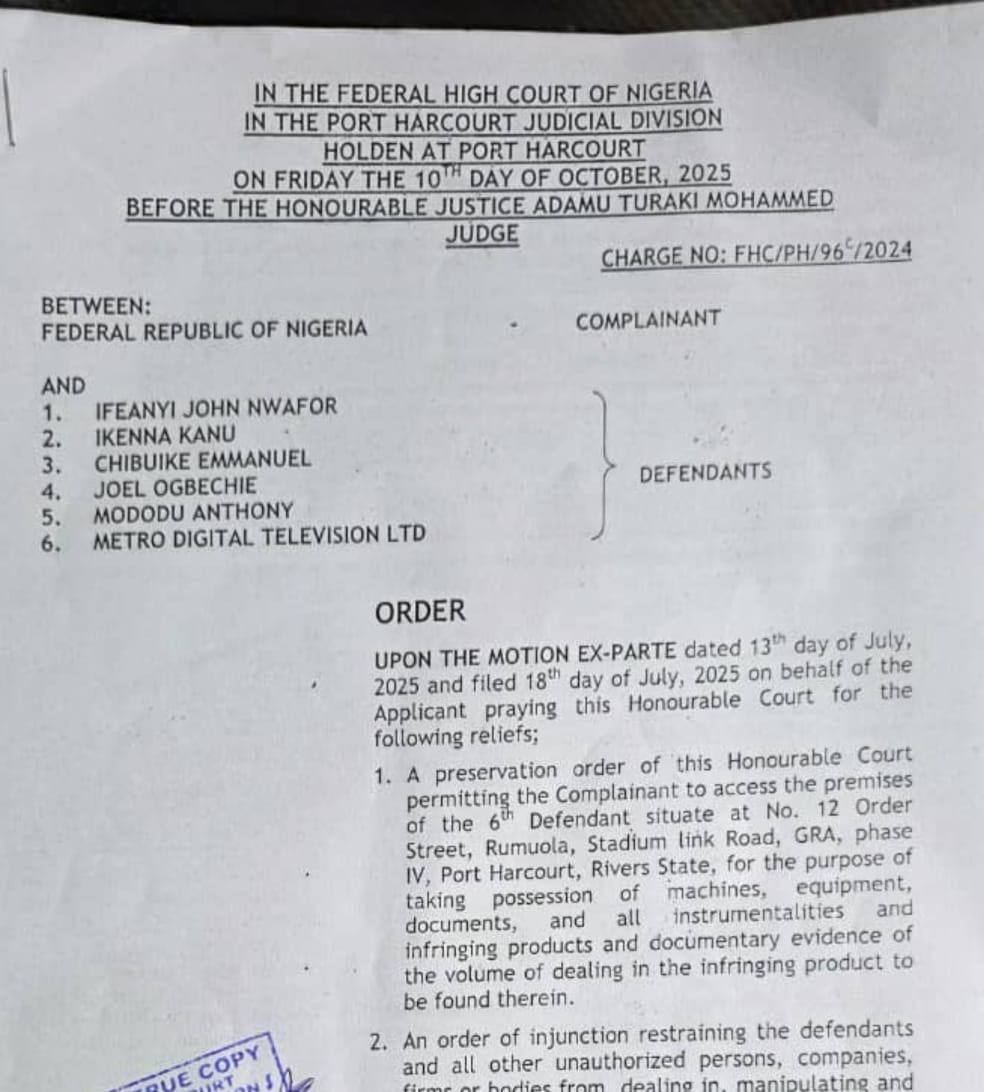 Operatives of the Economic and Financial Crimes Commission (EFCC), on Thursday, arrested two staff members of Metrodigital Television Ltd, operators of SLTV, in Port Harcourt, Rivers State, over alleged illegal rebroadcasting of DStv and GOtv content. The operation followed a Preservation Order issued by the Federal High Court empowering the EFCC and other law enforcement agencies to take possession of equipment and documents linked to the alleged piracy. TheThe raid, carried out at No. 12 Order Street, Rumuola, Stadium Link Road, GRA Phase IV, Port Harcourt, saw EFCC operatives seize broadcasting machines, decoders, transmission equipment, servers and several documents believed to contain records of signal manipulation. The Commission also took statements from staff members on duty during the enforcement action. The arrested men are Chinedu Nwaikwu, a director, and Uche Kanu, an engineer in the transmission room. They were caught with 22 decoders they were using for transmission at the time of arrest.The court’s Preservation Order specifically directed the EFCC to secure and label all items connected with the unauthorised rebroadcast of DStv and GOtv channels, and to preserve them as exhibits for trial. A detailed seizure report with photographs and serial numbers of the confiscated materials is expected to be tendered before the court.In a separate directive, the court issued an injunction restraining Metrodigital Television Ltd, its chief executive officer, Mr. Ifeanyi John Nwafor, and other associated companies including Denna Rossi Limited, Kristal Food and Beverages, and QTV Plus Limited from further accessing or transmitting the program-carrying signals, channels, and contents of DStv and GOtv pending the determination of the case.The injunction also mandated law enforcement agencies to serve the order on all the listed defendants, shut down any ongoing unauthorised signal feeds, and monitor compliance to prevent further infringement.Additionally, the court granted a Post-No-Debit (PND) restriction on several bank accounts linked to the alleged piracy proceeds. The affected accounts include those of Ifeanyi John Nwafor, Metrodigital Television Ltd/SLTV, Denna Rossi Limited, Kristal Food and Beverages, and QTV Plus Limited. The EFCC has been directed to notify commercial banks to enforce the restrictions, obtain account and BVN details, and preserve the funds as suspected proceeds of crime.The case has been adjourned to October 22, 2025, for plea and continuation of trial. The court, however, declined to grant the EFCC’s request for an arrest warrant and INTERPOL watch-listing of the defendants, noting that they had not yet been formally arraigned.The EFCC has since assured the court that all seized items have been properly secured and will be presented as evidence at the next hearing. The Commission reiterated its resolve to dismantle illegal content redistribution networks and protect the intellectual property rights of legitimate broadcasters.The arrests and seizures were executed strictly under the authority of the Federal High Court’s preservation, injunction, and Post-No-Debit orders.
